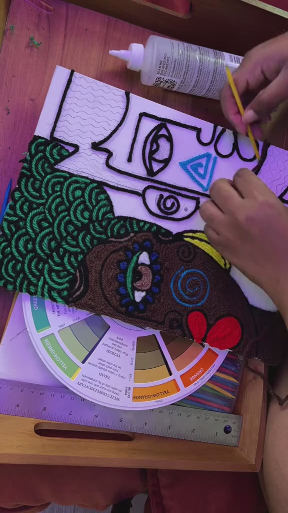 Inspired by the Huichol yarn paintings of Mexico, Donna uses fabric glue to adhere individual strands of yarn to canva; creating bold, colorful, and awe inspiring portraits. In her growing body of work, Donna gracefully explores themes of motherhood, spirituality, and joy in the context of Black feminine expression. Donna's international use of yarn serves as a reminder of the beauty, warmth, and softness of her subjects.