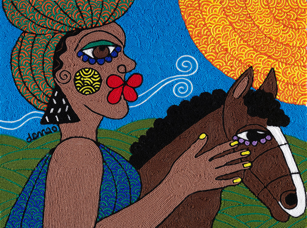 Every stitch of this yarn-on-canvas work was placed with intention, care, and love. Each detail, from the curve of her crown to the fibers shaping the horse’s eye, holds the heartbeat of my handwork and devotion.