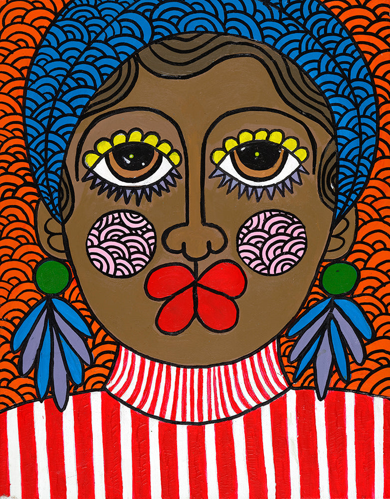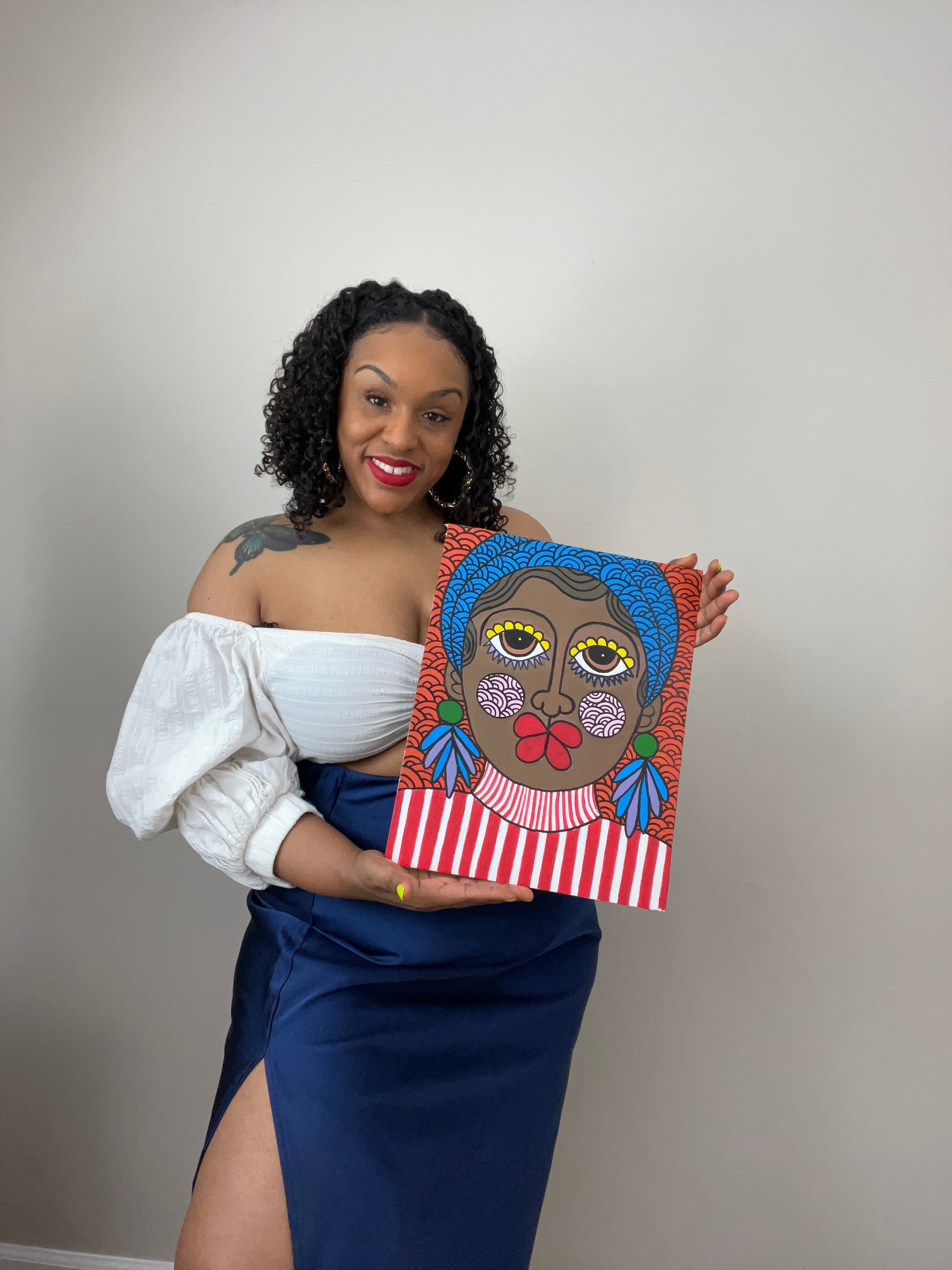 With her wide eyes, red-striped collar, and proud presence, War and Peace holds the tension of what it means to be a Black woman in a world that demanded survival at every turn. The red, white, and blue tones call to mind the American flag—but this isn’t patriotism. This is a reclamation.